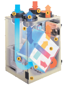 5. High efficiency heat recovery core – extracts heat from stale indoor air and transfers it to fresh outdoor air for maximum comfort with little heat loss. This core also removes excess humidity from recirculated air – lower humidity levels help you stay comfortable at higher temperatures in the summer and lower temperatures in the winter.